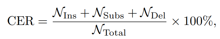 where NIns, NSubs, NDel are the character number of the three errors, and NTotal is the total number of characters. As standard, insertion, deletion, and substitution all account for the errors.